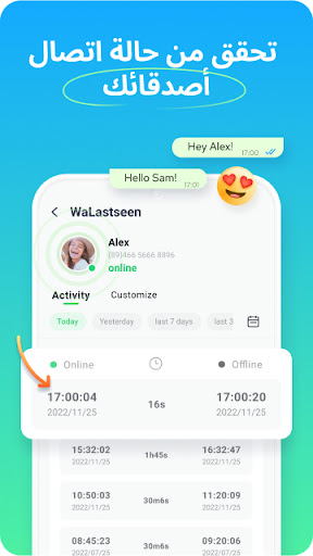 "أنا رجل أعمال وأريد معرفة متى يكون وكلائي وعملائي متصلين بالإنترنت حتى أتمكن من ترتيب خطة العمل اعتماداً على استخدامهم اليومي لـChatsApp. لم أكن لأستطيع إدارة عملي جيداً دون WaLastseen". - آرون